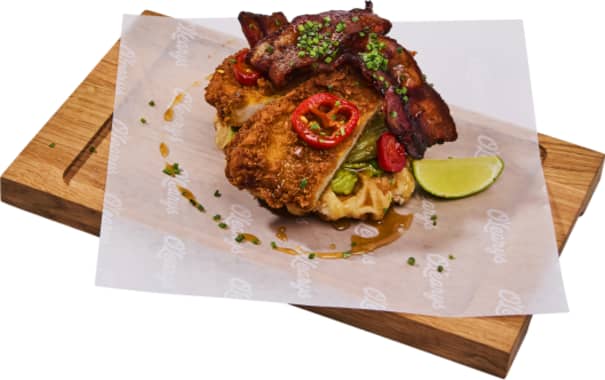 Krispigt friterad kyckling på belgisk våffla toppad med pickles, bacon, krämig guacamole, gräslök, picklad jalapeño, lime och hot honey.