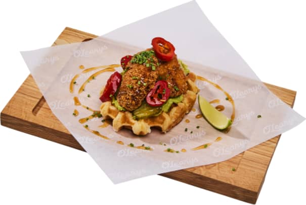 Krispiga Oumph! Buffalo Tenders på belgisk våffla toppade med pickles, krämig guacamole, gräslök, picklad jalapeño, lime och hot honey.