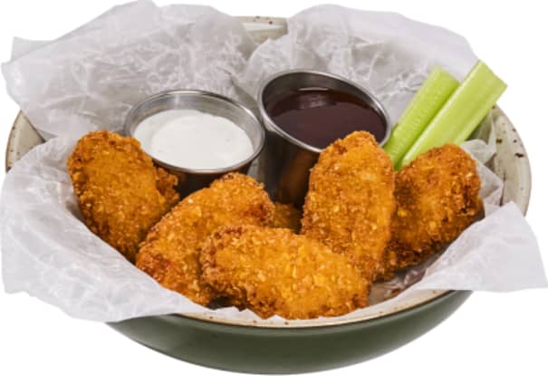 Friterade Oumph! Tenders slungade i O’Learys buffalosås. Serveras med selleristavar och krämig blue cheese dip.