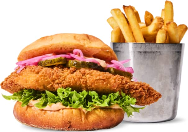 Krispfriterad kyckling med BBQ-majonnäs, picklad rödlök, krispsallad