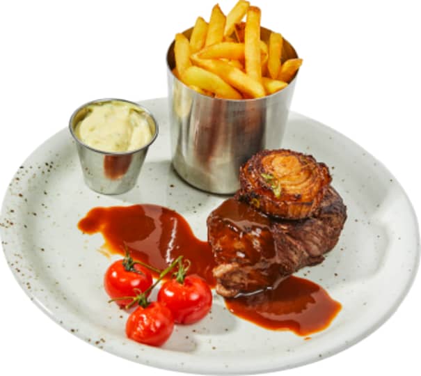 Grillad oxfilé som serveras med ugnsbakade körsbärstomater, timjansbakad lök, pommes frites samt bearnaise och rödvinssås.