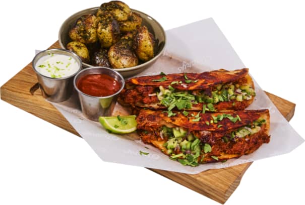 Två tortillabröd fyllda med birriamarinerad pulled chicken, toppad med gurksalsa, färsk koriander och lime. Serveras med chimichurrirostad potatis, birria-sås och krämig limedressing.