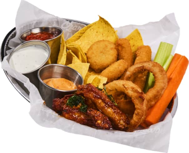 Classic buffalo wings, krispiga mozzarella sticks, heta jalapeño poppers, friterade lökringar, nachos, morots- och selleristavar. Serveras med chilimajonnäs, salsa och blue cheese dip.