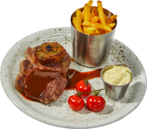 Grillad ryggbiff som serveras med ugnsbakade körsbärstomater, timjansbakad lök, pommes frites samt bearnaise och rödvinssås.